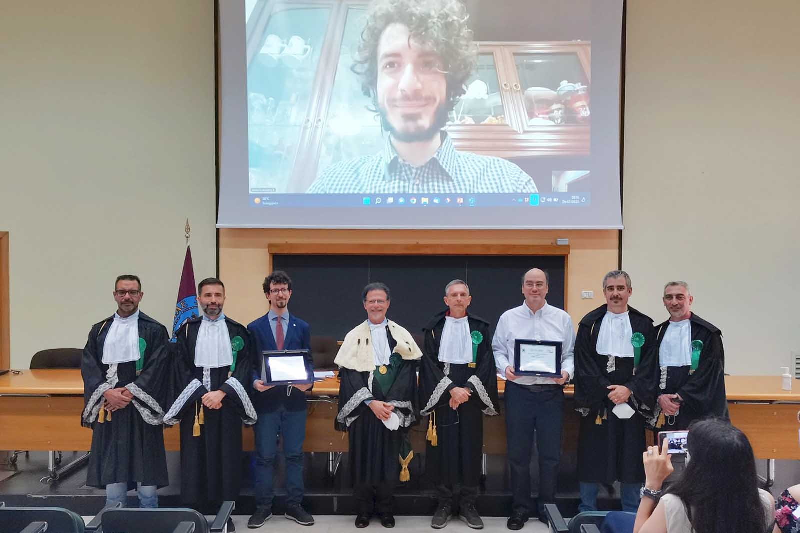 Il dott. Casablanca (presente in aula) si è laureato il 24 settembre dello scorso anno con una tesi dal titolo “Decentralizzazione del mercato dell'energia” (tutor il prof. Giuseppe Pappalardo e il dott. Giovanni Marotta). Il secondo premiato, il dott. De Domenico (in collegamento), ha conseguito la laurea magistrale il 30 luglio con una tesi dal titolo "Convexity and complexity results for polynomial sublanguages of Multi-Level Syllogistic” (tutor il prof. Domenico Cantone e il dott. Pietro Maugeri). Dalla tesi sono scaturite due pubblicazioni presentate al “35.th Edition of the Italian Conference on Computational Logic” e al “The Twelfth International Symposium on Games, Automata, Logics, and Formal Verication”. Il dott. De Domenico aveva già ricevuto il premio nel 2020 per la laurea triennale.