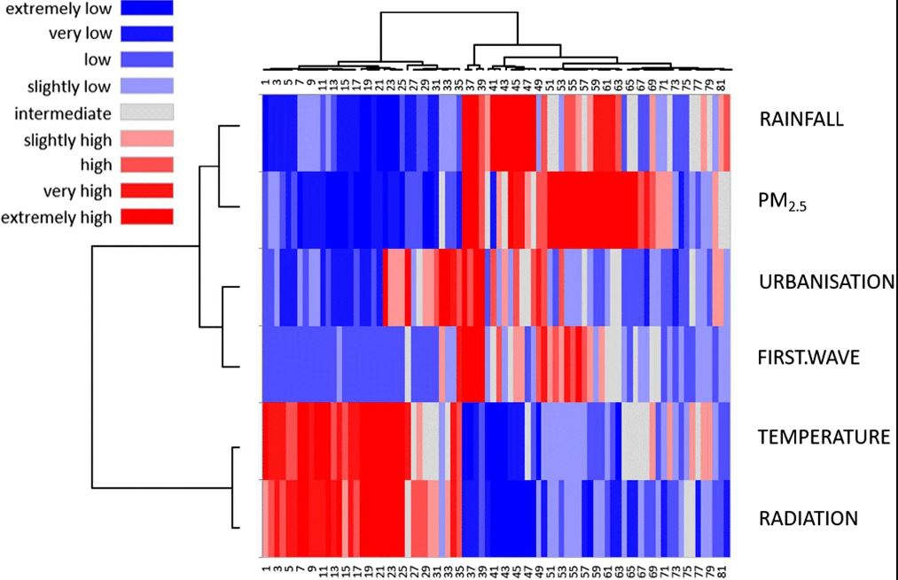 Figura 2. Mappa termica dei casi Covid e delle variabili ambientali per 82 domini urbani