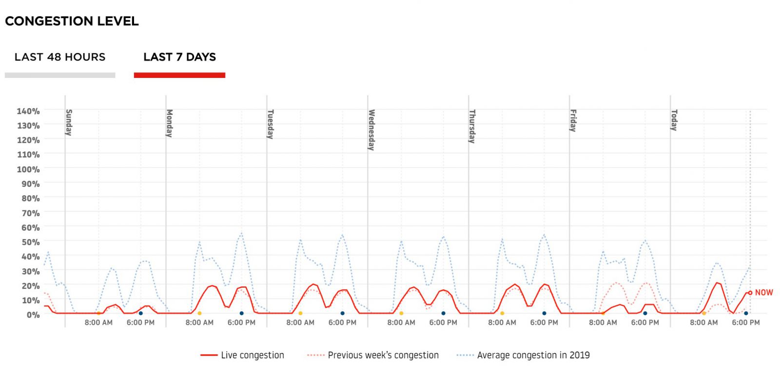 Andamento del traffico medio a Catania in termini di aumento percentuale del tempo di percorrenza rispetto all’assenza di traffico. Curva rossa continua periodo 26.4.20-2.5.20, curva rossa tratteggiata settimana precedente, curva blu valore medio 2019. (Fonte:Tomtom)