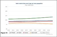 Nello specifico, la sedentarietà e l’obesità risultano essere aumentate nell’ultimo decennio, soprattutto nel Sud Italia dove questi fattori di rischio rappresentano la principale causa per lo sviluppo di patologie cronico-degenerative, inclusi i tumori (Figura 1A e 1B). Viceversa, il consumo di bevande alcoliche registra al SUD un trend di diminuzione (Figura 1C).