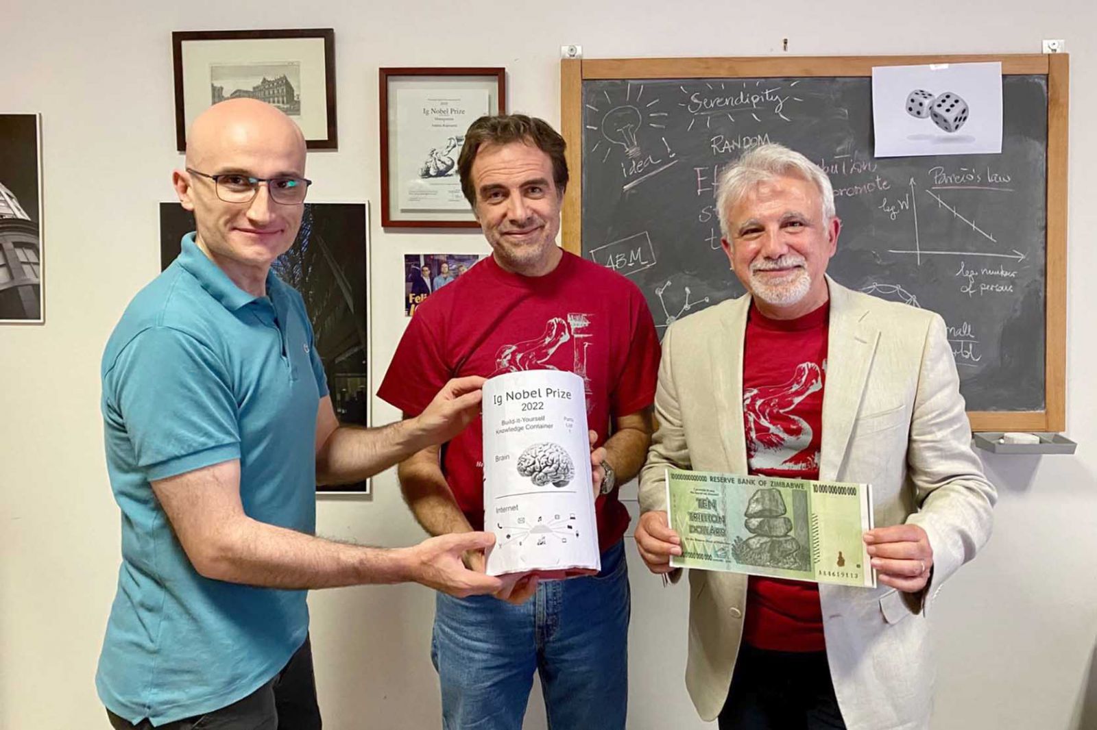 Da sinistra i docenti Alessio Emanuele Biondo, Alessandro Pluchino e Andrea Rapisarda con il premio Ig Nobel