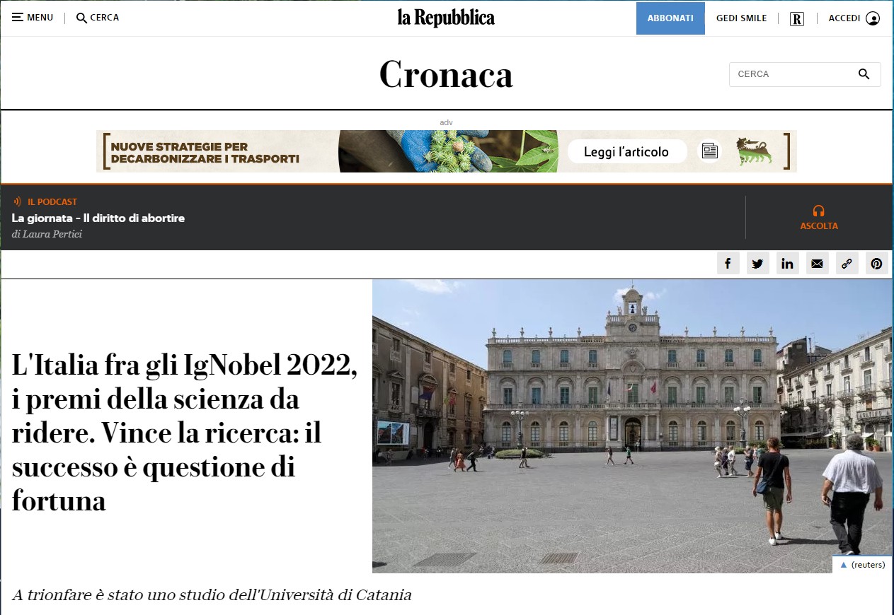 «I premi Ig Nobel vengono assegnati ogni anno, dopo essere stati selezionati su più di 10 mila nomination, da un comitato composto anche da veri premi Nobel, durante una cerimonia molto divertente, ideata proprio per avvicinare la scienza al grande pubblico, a 10 studi pubblicati su riviste prestigiose con la motivazione che devono far prima ridere e poi pensare. I risultati di questa ricerca tutta catanese potrebbero sembrare a prima vista paradossali, ma, pensandoci un po’ su, inducono a riflessioni più profonde e interessanti» spiegano i ricercatori.