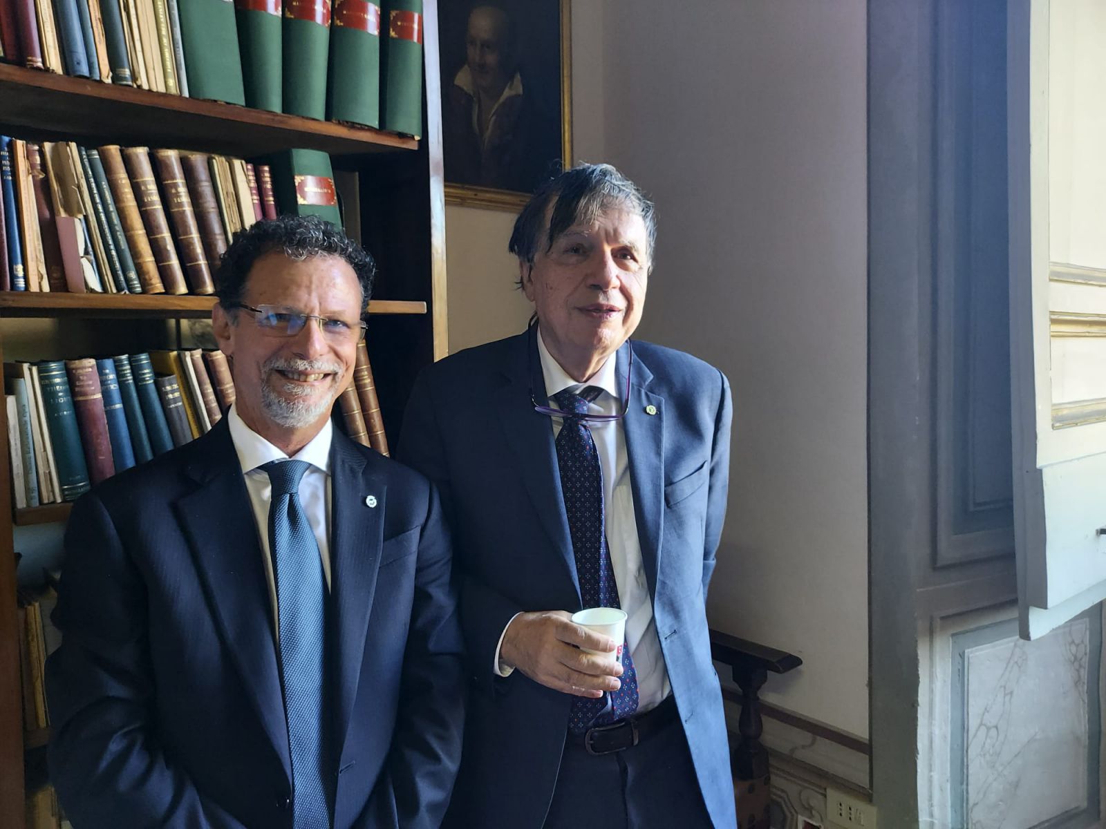 Il rettore Francesco Priolo con il premio Nobel per la Fisica 2021, Giorgio Parisi, vicepresidente dell'Accademia dei Lincei, a margine della cerimonia d'investitura