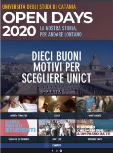 La pagina, infatti, resterà attiva con i suoi contenuti informativi multimediali fino alla conclusione del periodo delle immatricolazioni. Da questo punto di vista, la conclusione degli Open Days rappresenta anche l’inizio della campagna di orientamento e informazione sulle immatricolazioni. Il sito manterrà disponibili tutte le registrazioni delle tre giornate degli Open Days (dedicate rispettivamente ai dipartimenti delle aree delle Scienze Fisiche e Ingegneria, delle Scienze della Vita e delle Scienze sociali e umanistiche) e rappresenta una vera e propria landing page dalla quale raggiungere le video-presentazioni dei dipartimenti e le pagine relative all’offerta formativa, ai servizi per gli studenti, all’orientamento, alla guida dello studente, ai servizi per gli studenti e alla brochure informativa. Una sezione della pagina descrive i 10 buoni motivi per i quali uno studente dovrebbe scegliere di iscriversi all’Università di Catania. La pagina è stata realizzata graficamente dal web staff dell’Acri, in collaborazione con la web tv d’Ateneo Zammù Tv.