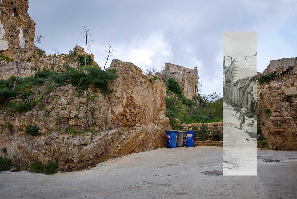Foto 1: Rifotografia di uno scorcio del paese di Montevago (Agrigento). La prima fotografia (in bianco e nero) è stata scattata poco dopo il terremoto, la seconda (a colori) è stata scattata nel 2020. Si nota come poco o nulla sia cambiato in 52 anni