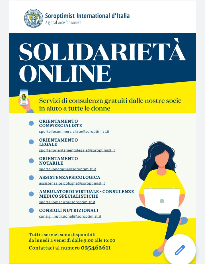 L’associazione, che conta in Italia 5mila socie e 157 club, ha ampliato il supporto gratuito alle donne e in generale a chi si trova in difficoltà dopo il lockdown. Cittadini, imprese, artigiani, commercianti in difficili condizioni economiche o di salute possono rivolgersi allo sportello telefonico gratuito multidisciplinare ( tel. 02. 5462611 dalle 9 alle 16) per una consulenza medico specialistica (sportellomedico@soroptimist.it), fiscale (sportellocommercialiste@soroptimist.it), notarile (sportellonotarile@soroptimist.it), legale (sportellorientamentolegale@soroptimist.it), psicologica (assistenza.psicologhe@soroptimist.it), o per consigli nutrizionali (consigli.nutrizionali@soroptimist.it).