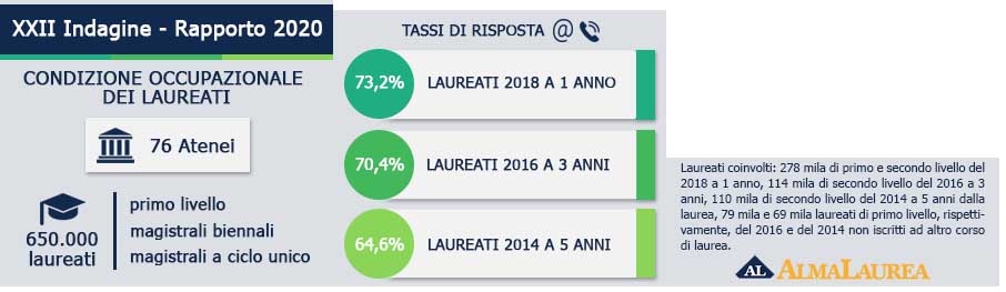 A un anno dalla laurea il tasso di occupazione è pari al 56,6%. Il 21,6% prosegue il lavoro iniziato prima della laurea, il 10,0% ha cambiato lavoro; il 68,4% ha iniziato a lavorare solo dopo il conseguimento del titolo. Tra i laureati magistrali biennali le percentuali sono, rispettivamente, pari a 26,2%, 12,7% e 61,1%; tra i magistrali a ciclo unico sono pari a 12,4%, 4,5% e 83,1%. Gli occupati con contratto a tempo indeterminato sono il 26,7%, cresce il dato dei lavoratori part-time (34,4%). Aumenta la retribuzione media (1.183 euro mensili netti, nella precedente rilevazione era pari a 1.128 euro). Il 63,3% degli occupati ritiene la laurea conseguita molto efficace o efficace per il lavoro che sta svolgendo; il 53,6% dichiara di utilizzare in misura elevata, nel proprio lavoro, le competenze acquisite durante il percorso di studi.