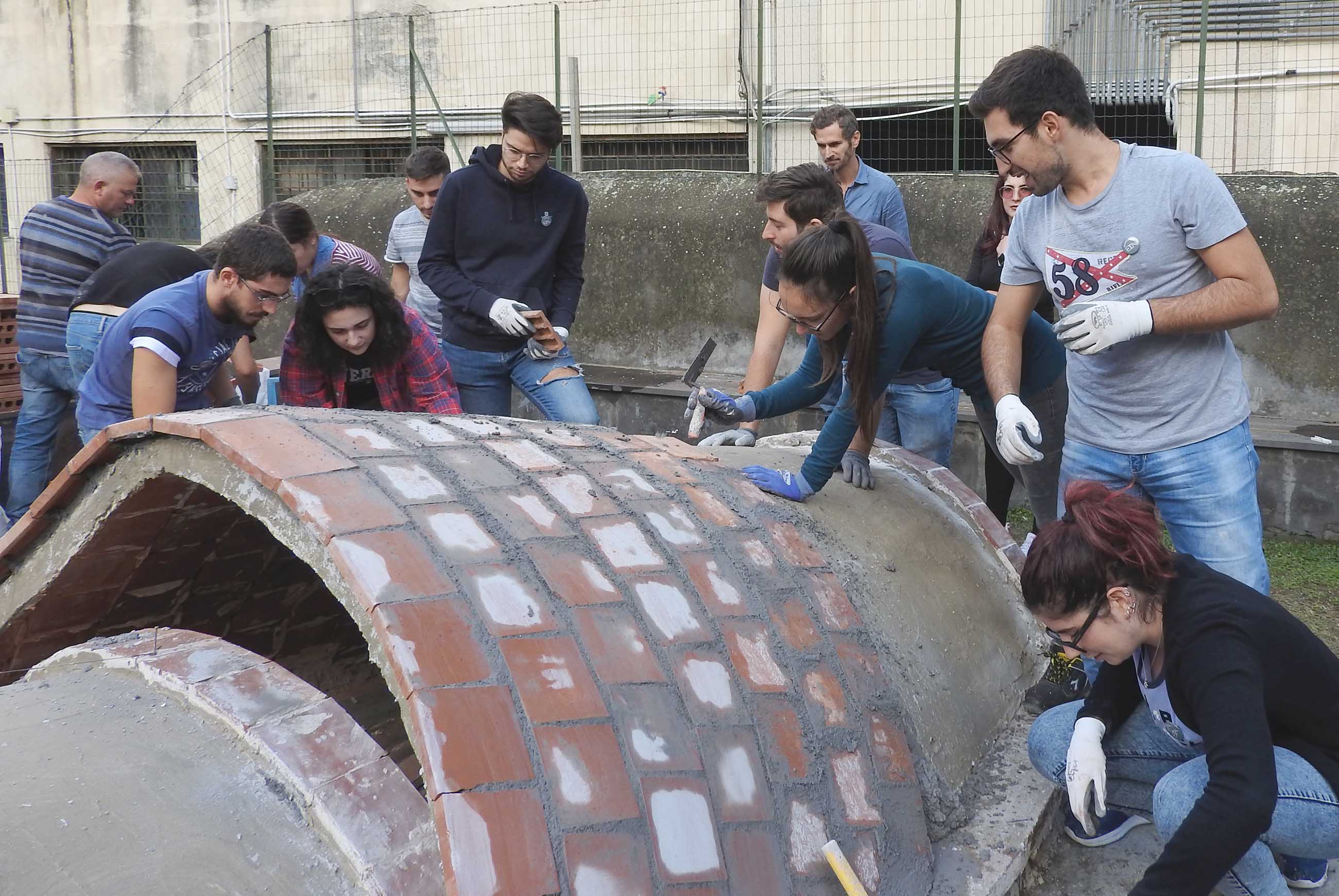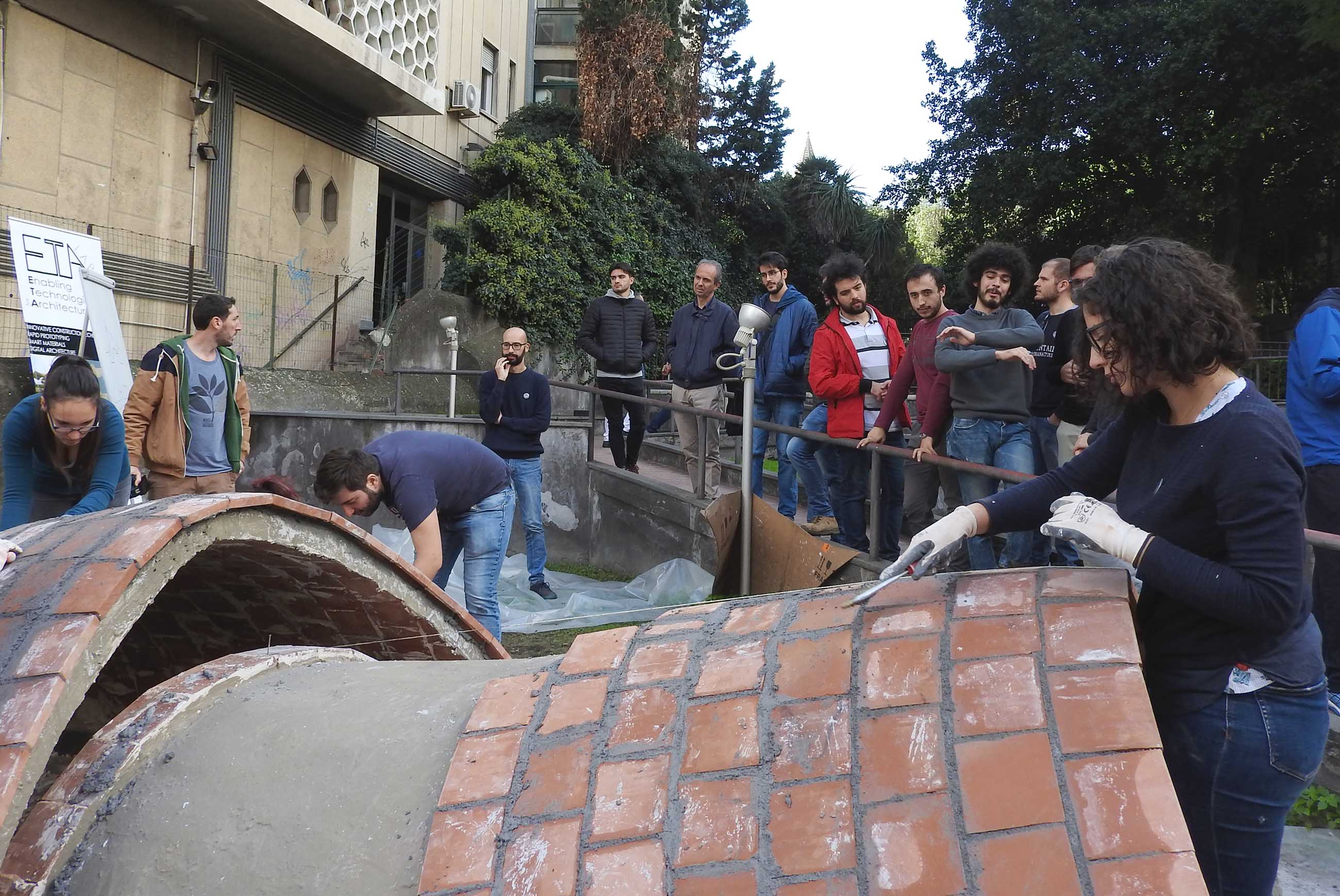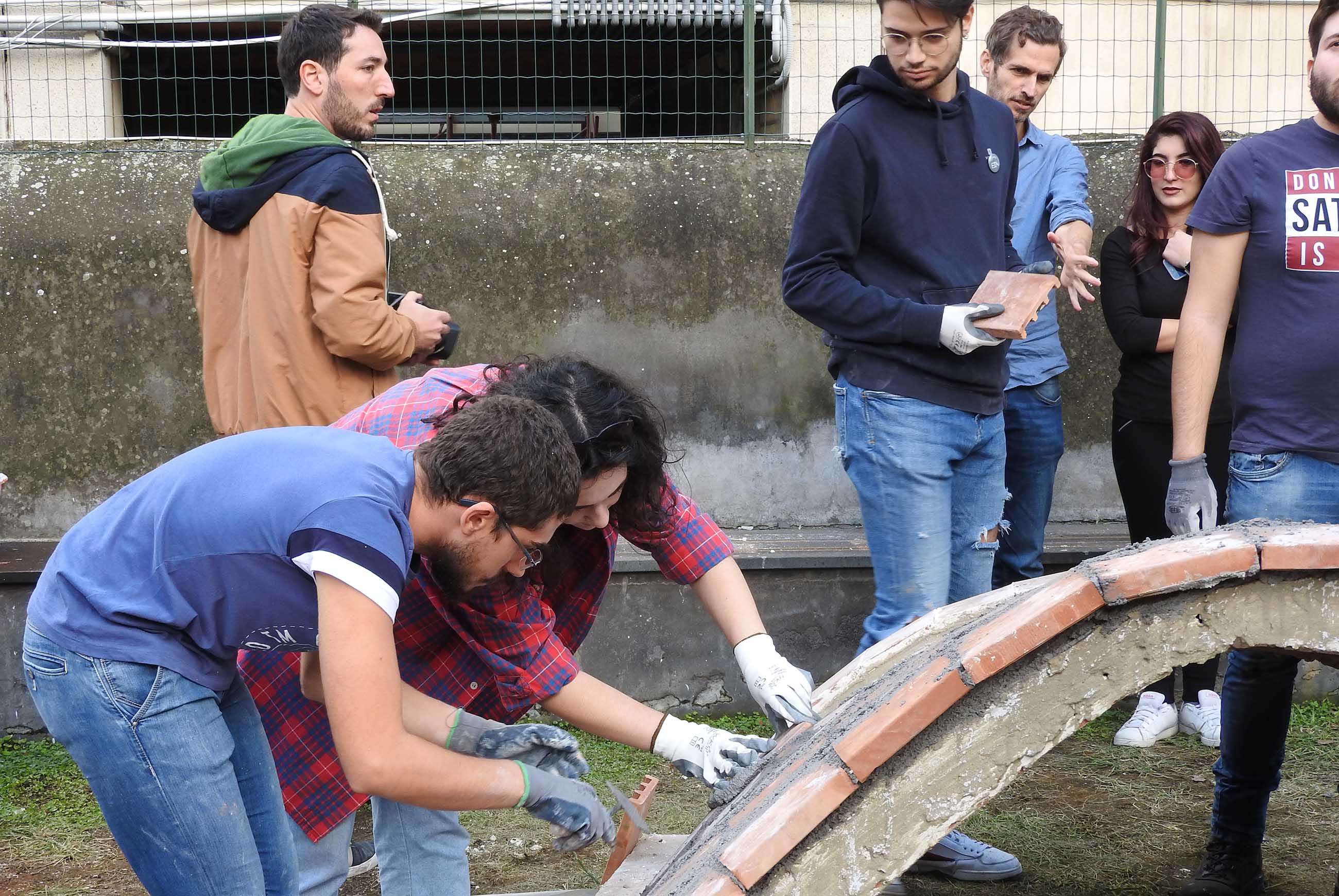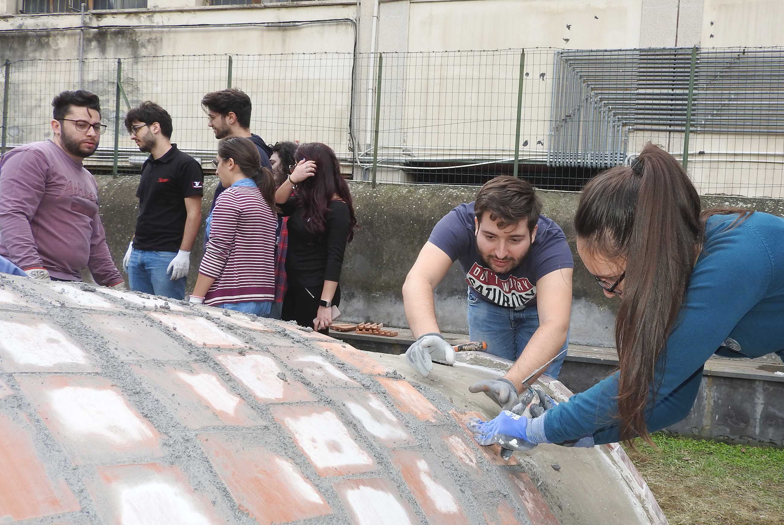Dalla teoria alla pratica, con tanto di cazzuola e mattoni in mano, per realizzare due volte sperimentali in blocchi in laterizio forato a conclusione di un modulo di Architettura digitale nell'ambito del corso e delle attività laboratoriali di Architettura tecnica II del corso di laurea magistrale in Ingegneria Edile-Architettura.
