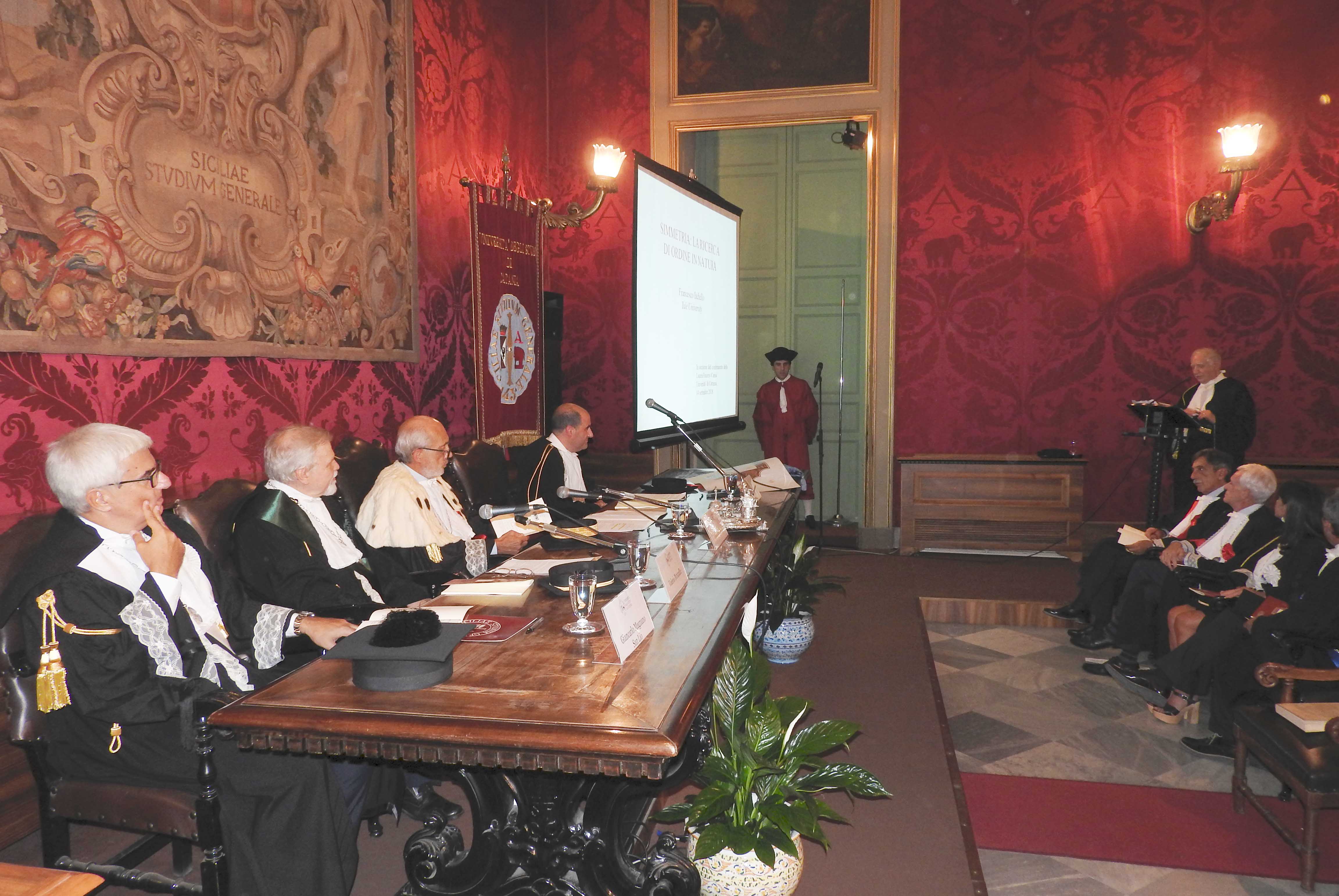 “Il contributo del prof. Iachello è stato fondamentale alla ancestrale ricerca di ordine in Natura attraverso l'introduzione di modelli innovativi, basati sulle simmetrie dinamiche, e per le loro applicazioni a sistemi fisici nucleari, atomici e molecolari, che tracciano un eccezionale percorso di scoperta e di guida per le nuove generazioni di scienziati”. Questa la motivazione espressa dal direttore del dipartimento di Fisica e Astronomia Valerio Pirronello per la quale l’Università di Catania ha assegnato a Francesco Iachello, professore emerito all'Università di Yale, la laurea honoris causa in “Fisica”. La cerimonia di consegna si è tenuta oggi pomeriggio nell’aula magna del Palazzo centrale alla presenza delle maggiori autorità accademiche.