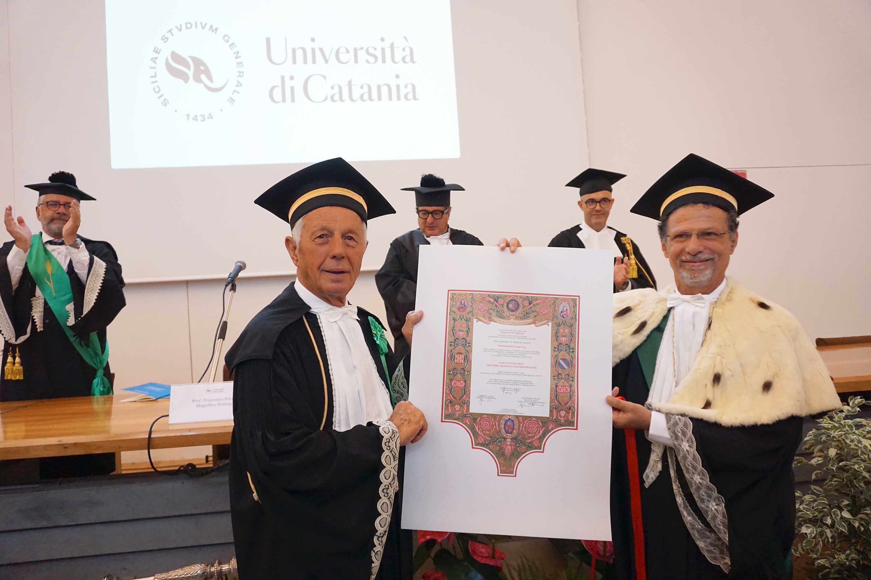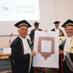 Al di là delle tradizionali formule accademiche che si addicono a uno degli eventi più solenni dell’Ateneo, nella sua introduzione alla cerimonia che si è tenuta questa mattina nell’aula magna “Santo Mazzarino” del Monastero dei Benedettini, il rettore Francesco Priolo ha voluto sottolineare ancora una volta il forte legame che esiste fra l’Università e la sua comunità di riferimento: «L’Ateneo dialoga e intende sempre più dialogare con tutte le componenti della società: le Istituzioni e tutti i soggetti attivi sul terreno della cultura, del lavoro, dell’economia, delle imprese, delle professioni e della solidarietà presenti nella città e nella regione. I due nuovi dottori magistrali dell’Università di Catania, Faro e Tornatore, sono personaggi ampiamente conosciuti e apprezzati, anche oltre i confini della nostra terra, per i loro meriti e le loro capacità imprenditoriali, affermatesi in un contesto di competizione globale, mantenendo tuttavia sempre un forte radicamento e una tangibile presenza nella realtà siciliana».