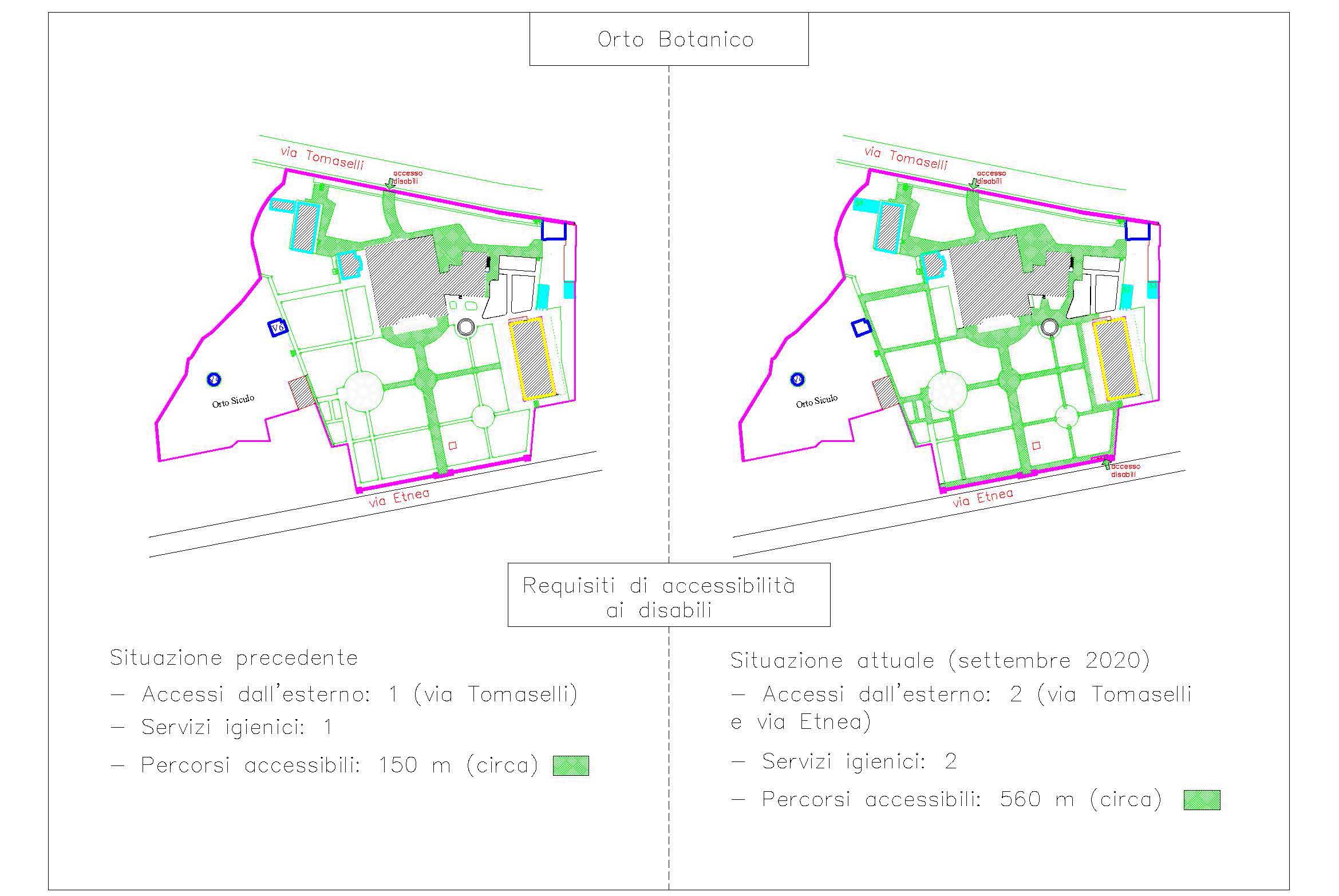 Sono stati completati in questi giorni gli interventi di abbattimento delle barriere architettoniche all’Orto Botanico dell’Università di Catania. I lavori hanno previsto il rifacimento della pavimentazione dei vialetti del giardino etneo, la realizzazione di un accesso per diversamente abili da via Etnea (che si aggiunge a quello già presente in via Tomaselli) oltre che di un nuovo accesso ai servizi igienici (ad oggi sono due). Gli interventi hanno permesso così di rendere accessibile ai diversamente abili un percorso di quasi 600 metri all’interno del giardino botanico.
