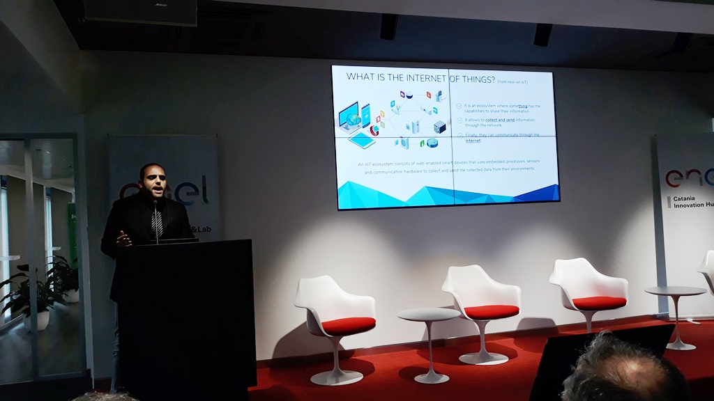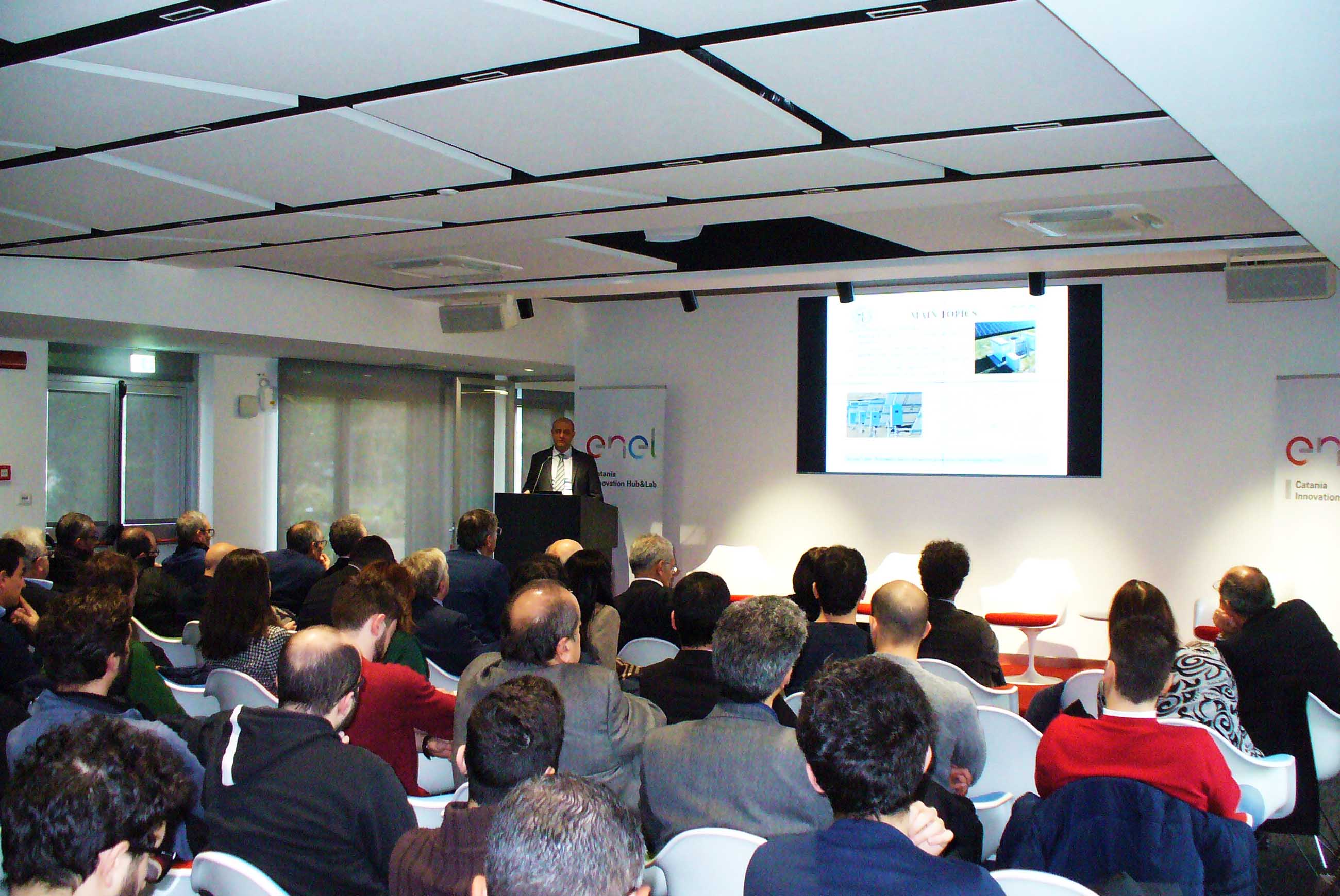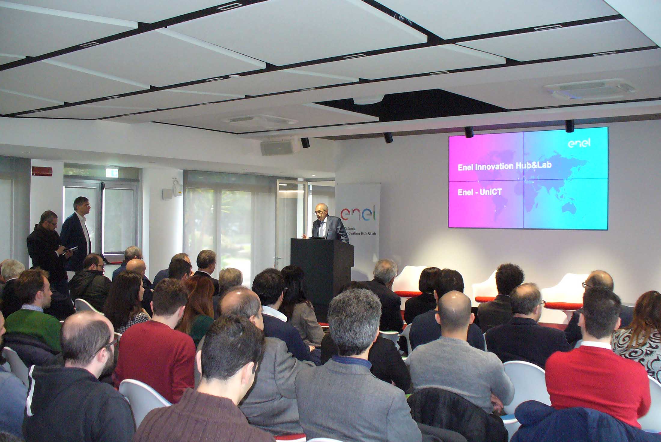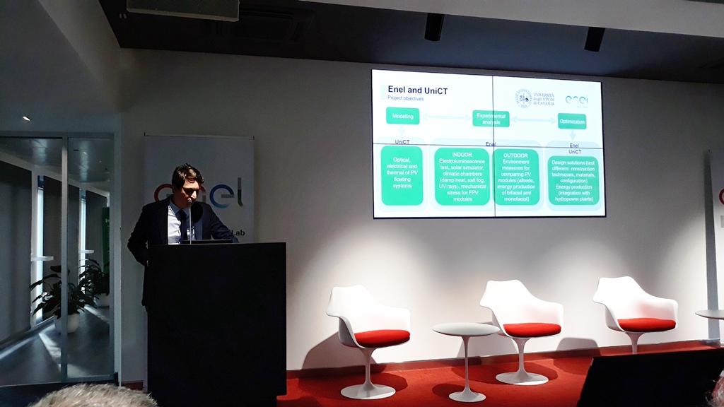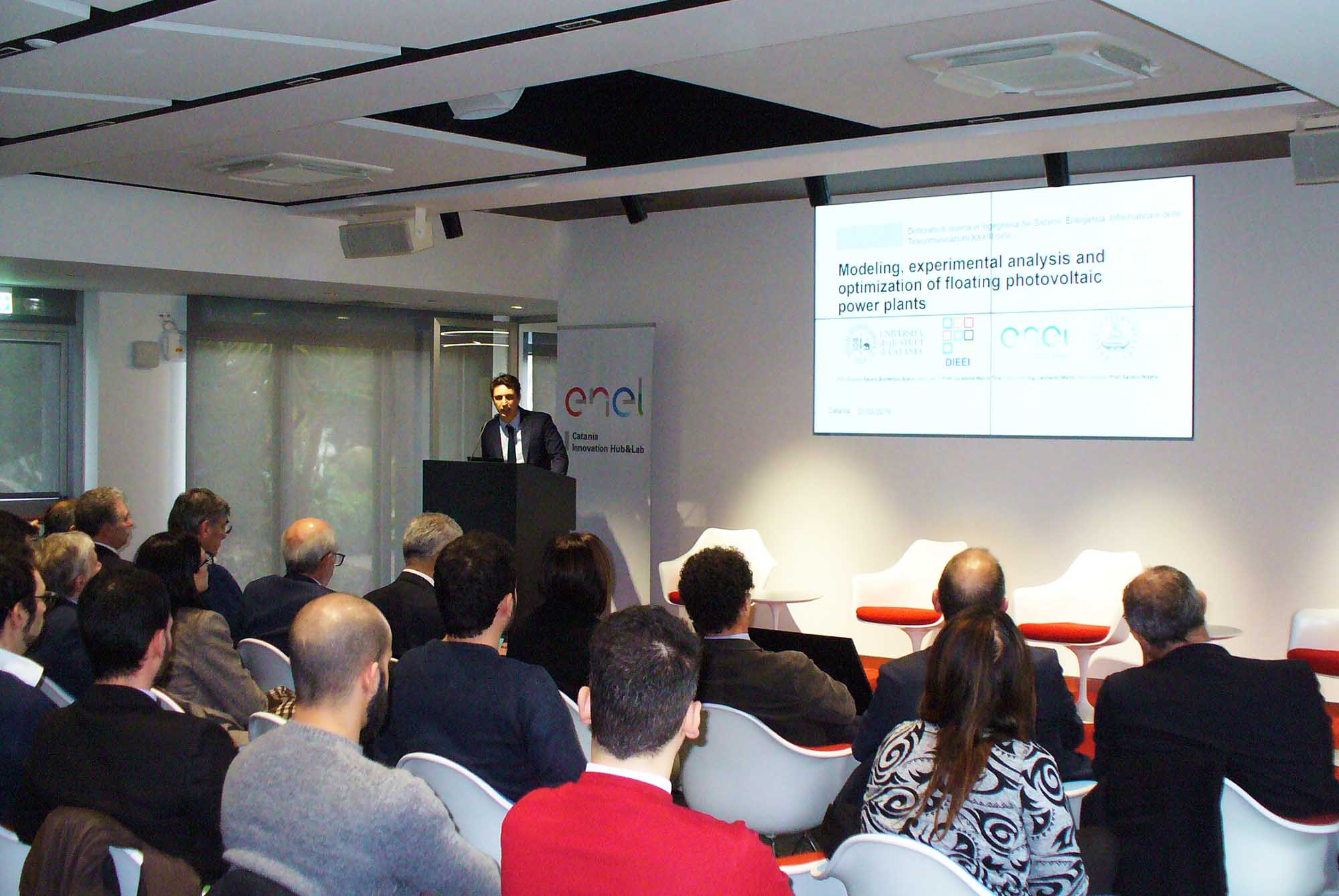Nel corso della visita, i quattro dottorandi che lavorano con Enel (Fabio D’Urso, Federico Fausto Santoro, Fausto Bontempo Scavo e Gianni Nobile), con la guida di tutor accademici e aziendali, hanno presentato ai docenti, ai propri colleghi e agli studenti dei corsi di laurea magistrali di ingegneria, informatica e fisica intervenuti, alcuni aspetti delle loro attività di ricerca che spaziano dalla robotica ai droni, dai sistemi intelligenti alla cosiddetta Internet of Things, dai pannelli fotovoltaici galleggianti alla seconda vita delle batterie, “a testimonianza – come ha osservato il prof. Terrasi – della “varietà di competenze e possibilità che offre questo ambiente, favorendo lo scambio tra ricerca accademica ed applicazione industriale”.