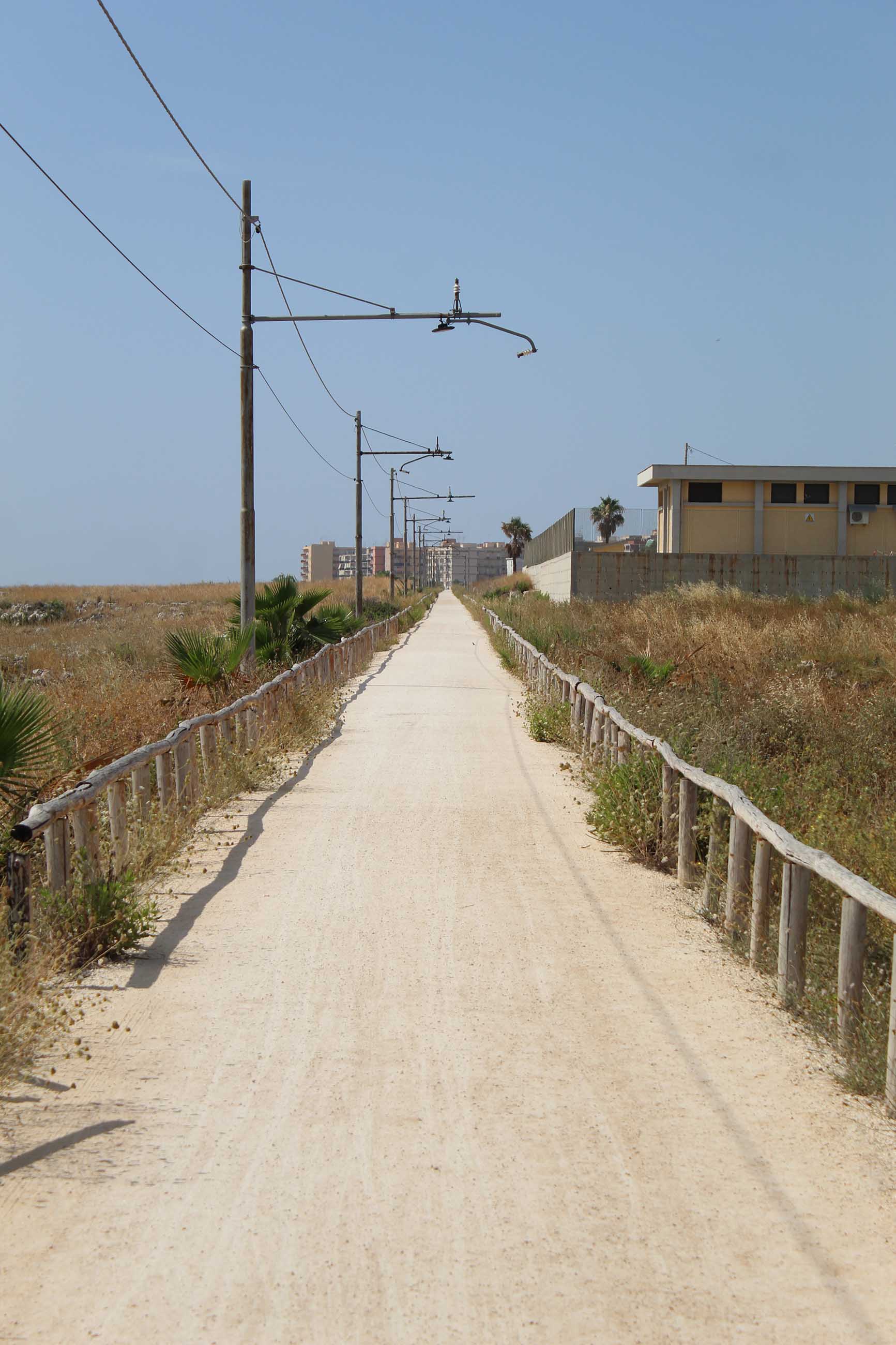 Il primo intervento consiste nella realizzazione di una scala e di un sistema di sedute. La scala connette la pista ciclabile al quartiere e alla costa, in un punto dove ogni estate viene realizzata una piattaforma per la balneazione. È realizzata è realizzata in legno, con un sistema di incastri e viti e un'armatura di acciaio ancorata alla scarpata. Il prototipo di seduta, è stato posizionato in un punto strategico dove si intravedono l'Etna e la costa ionica e realizzato in legno multistrato marino con un sistema di incastri e viti. I manufatti sono stati realizzati con la collaborazione del laboratorio "Allestiamoci" coordinato dal prof. Gianfranco Gianfriddo. Le parti di legno sono state tagliate con le macchine a controllo numerico della SDS di Architettura di Siracusa.
